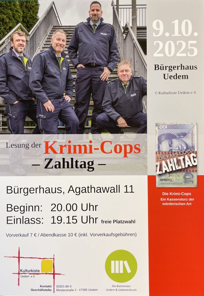 Die Krimi-Cops lesen im Bürgerhaus Uedem, am 9. Oktober 2025, um 20 Uhr 9. August 2025 von Büchereiteam Uedem Karten gibt es auch in den Büchereien Uedem & Uedemerbruch!