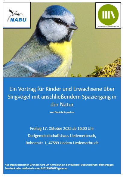 Das Büchereiteam Uedemerbruch lädt alle Kinder ab ca. 5 Jahren und Erwachsene zu einem Mitmachvortrag zum Thema Singvögel ein. Im Anschluss besteht die Möglichkeit ein Fernglas zu basteln und, je nach Wetterlage, noch in der Natur auf Entdeckungsreise zu gehen.