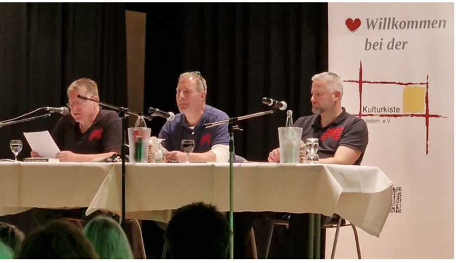 Die Krimi-Cops sind bekannt dafür, authentische Geschichten aus ihrem Polizeialltag in spannenden und zugleich unterhaltsamen Kriminalromanen zu verarbeiten. Obwohl eigentlich zu viert geplant, traten sie urlaubsbedingt nur zu dritt auf und überzeugten dennoch mit einer mitreißenden und lebendigen Bühnenshow, die Spannung und Humor perfekt miteinander verband.